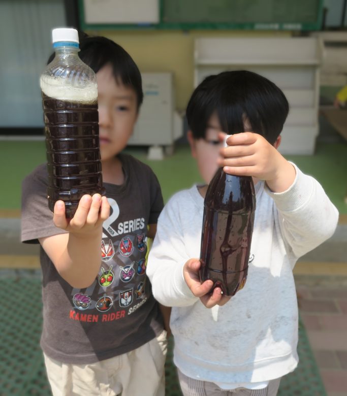 ペットボトルの中身はコーラだそうです。子ども達が嬉しそうに教えてくれました。「泡が出るんだ!」とペットボトルを振るお友達もいました。本物のコーラは振らないでね…