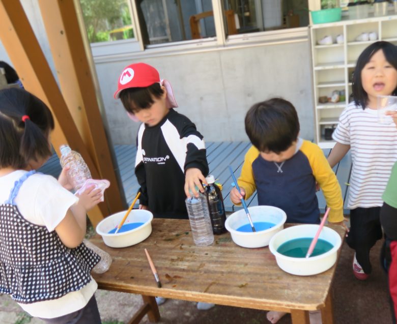 色水遊びが楽しかったようで、自由遊びの時間に何度も作っている姿があります。あかぐみ、みどりぐみのお友達も「なにしているの?」と集まり、色々な色の色水を作っていました。
