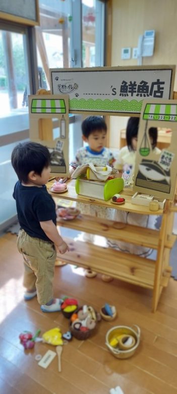 日々の保育 2025年5月22日 ayame_master おみせやさん(あかぐみより) あかぐみでは、お魚屋さんが開店しました。 近くに釣り堀もあり、新鮮なお魚が並んでいます。 注文したらお父さんとお母さんがお魚以外の食べ物も出してくれます。 (あかぐみ副担任より) << さつまいもの苗植え 保育参観日 >>