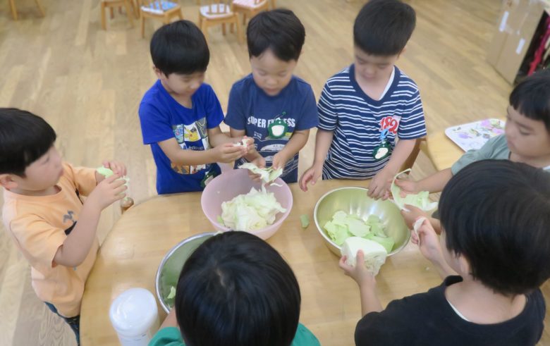 子どもたちが大きなキャベツを、一枚ずつ小さく丁寧にちぎってくれました。キャベツの感触を感じながら触っていました。