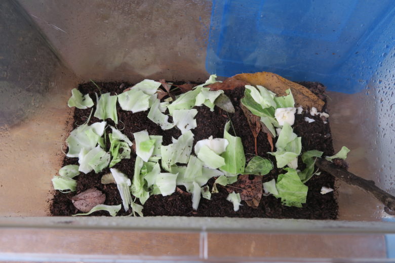今回の食育で子どもたちがちぎったキャベツを、虫かごのダンゴムシたちにあげました。子ども達が「まだあげたい!」と、土が見えないくらいにたっぷりです。