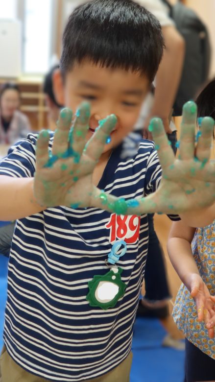 みんなの手が寒天で、みどり色、あか色、黄色や青色になっていました。
