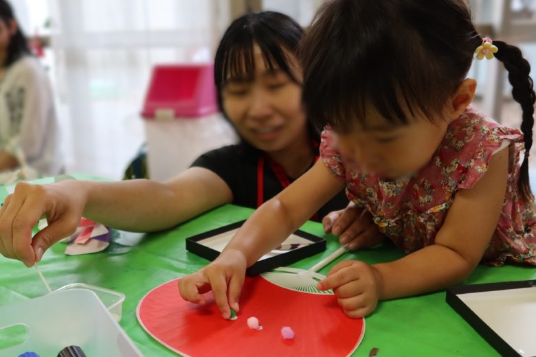 お母さんがうちわにボンドを付け、こどもがパーツを選んでうちわに付けて、協力をして作る親子もいました。