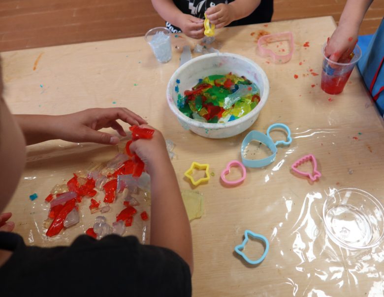 あかぐみのお部屋は、寒天コーナーです。透明なカップに入れたり、型抜きをしたり、つぶしたりして、感触を楽しみました。