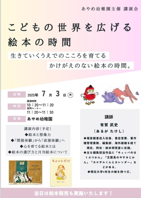 とても意義深い時間を過ごさせてもらっているので、広島こどものとも社の社長さんに、絵本を通しての学びを保護者の方と共有したいのですがと相談し、今回の講演会が実現できました。
