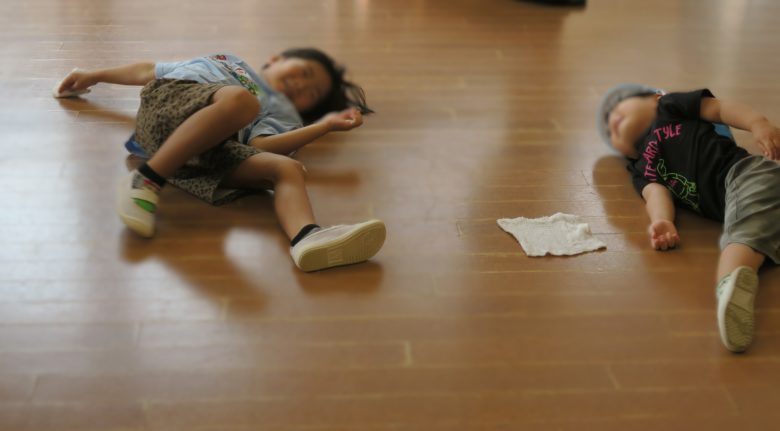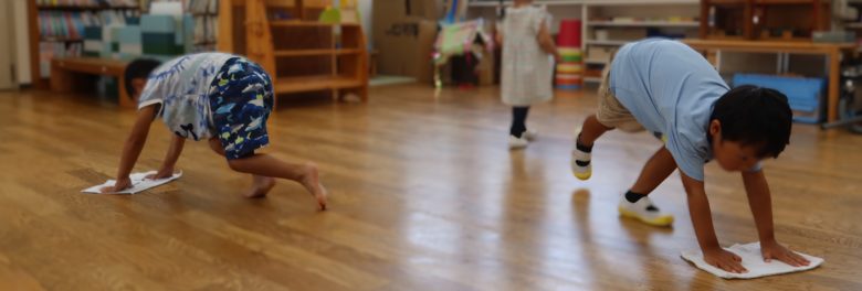 雑巾を手に、床を拭くこどもたちを発見!転ばないように、素早くまっすぐ進んでいました。