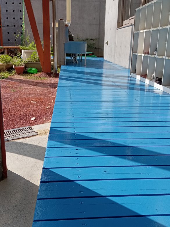 さて、幼稚園ではあか・きいぐみさんとくすのきの周りのウッドデッキを、大工さんにお願いして修理してもらいました。
