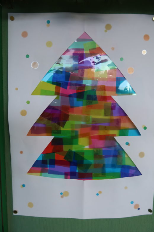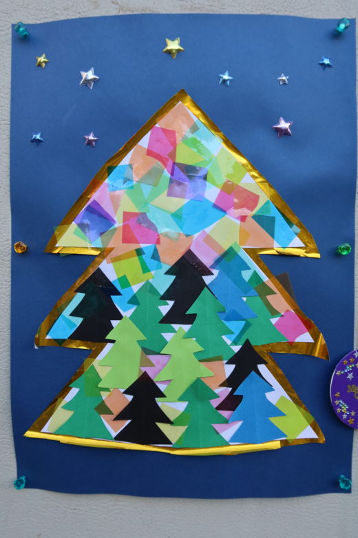 こちらはツリーのくりぬいた部分を利用して作りました。時間が足りず、半分は先生が貼りました。