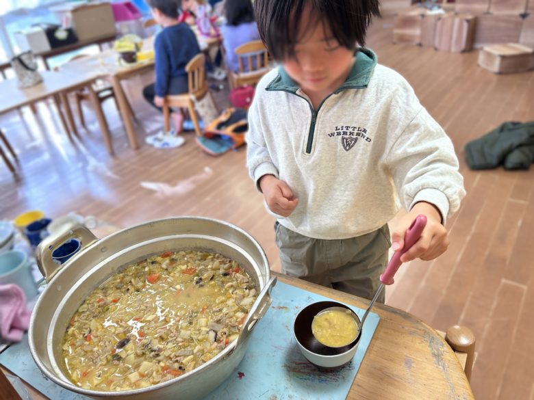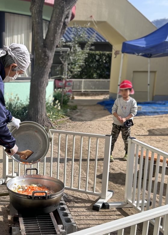 園庭で鍋をぐつぐつと煮ます。近くの椅子に座って、「火の匂いがする!」「まだかな~」「おいしそう」と楽しみにできあがるのを待っていました。