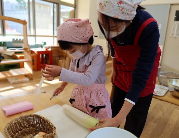 野菜の皮をピーラーでむいたり、子ども用包丁で食材を切ったりとたくさんお手伝いしてくれました。