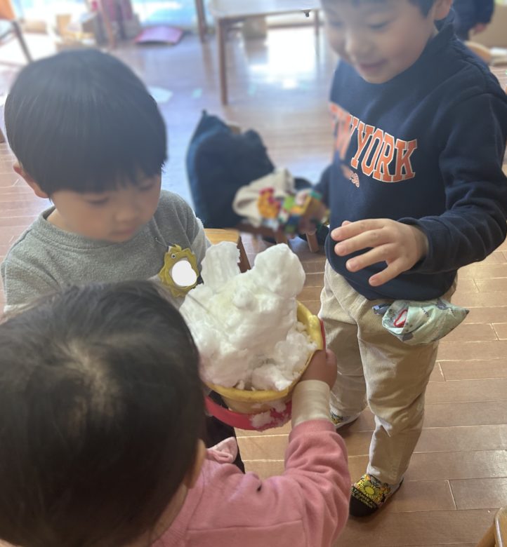 あかぐみ(年少)のお友達が、きい(年中)さんに、バケツに入った雪ウサギを見せにきてくれました。