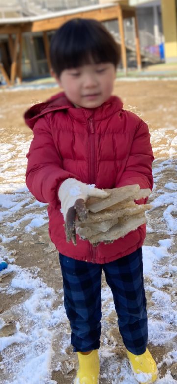 寒い一日でしたが、子どもたちから進んで外に出て、十分に体を動かしながら、様々な雪遊びを楽しんでいました。そして、雪に興味関心をもち、自然と触れ合う中で発見を楽しんだり、考えたり、不思議さに気づく経験ができましたと思います。