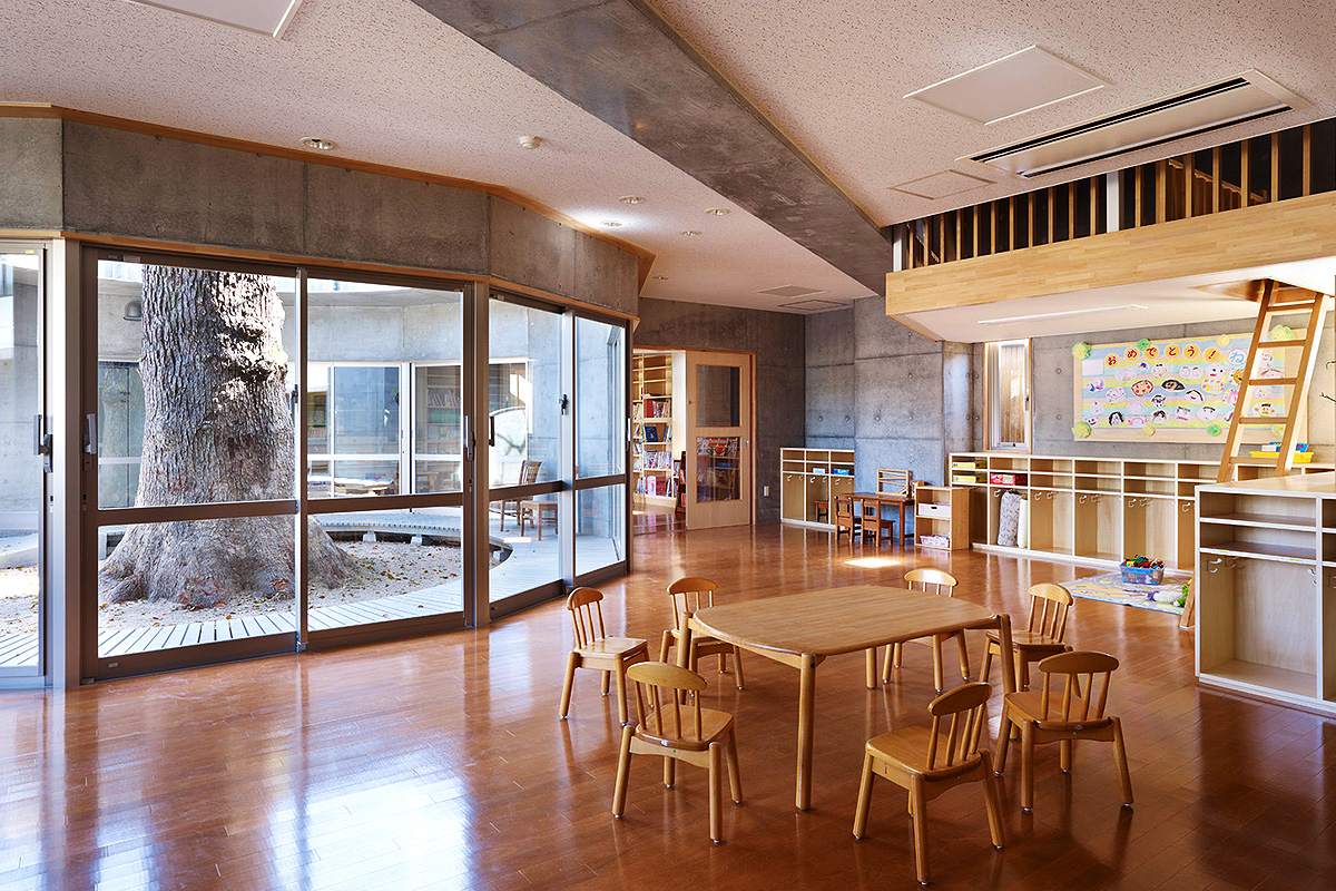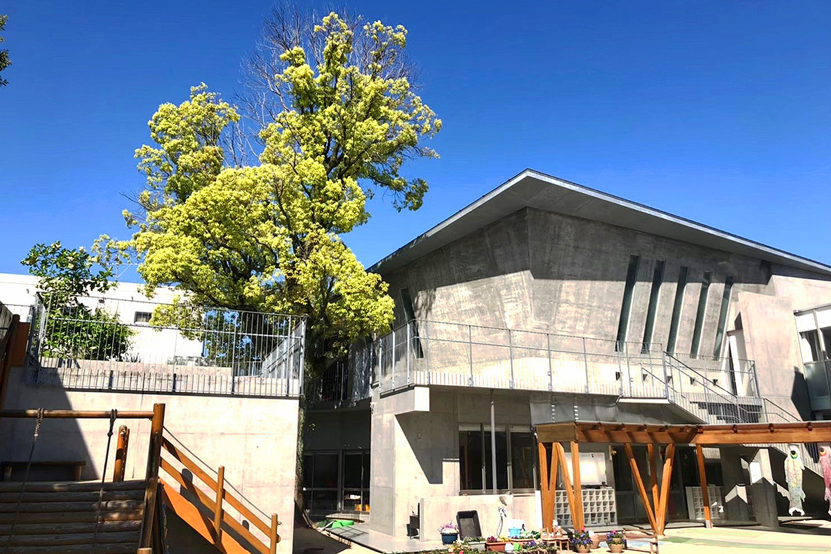住宅街の中にあっても大きなくすの木や日当たりの良い庭と屋上庭園があり、季節の変化を感じ取れます。 多様な草花が植えてあり、いろんな鳥や虫たちがやって来ます。 保育室は各年齢1部屋と図書室、行事の時には2階の礼拝堂やホールを使います。 園児の机や椅子は木製です。できるだけ自然の素材を用いた用具をそろえています。